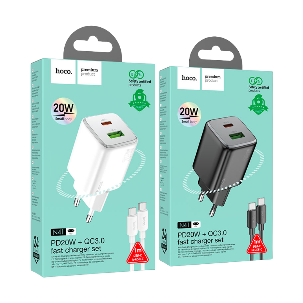 Compact 20W USB-C wall charger by HOCO, designed for fast and safe charging. Ideal for smartphones, earbuds, and other USB-C devices. Perfect for home, office, or travel use.